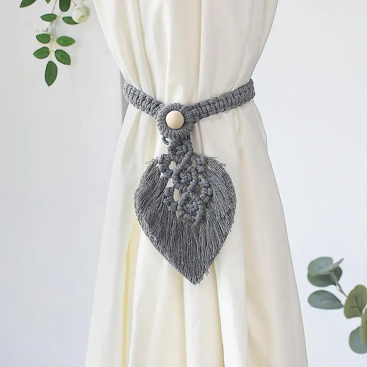 Enhance the beauty of any drapes with a stunning macrame curtain tieback! This exquisite tieback features a unique leaf-shaped design that infuses your space with an air of chic elegance, making it a perfect addition to your aesthetic room decor. Not only does it serve a functional purpose by holding curtains neatly together, but it also acts as a stylish accent that complements various interior styles.
