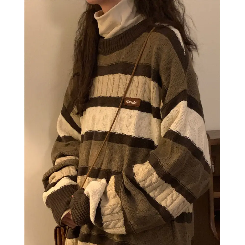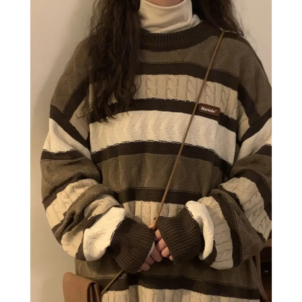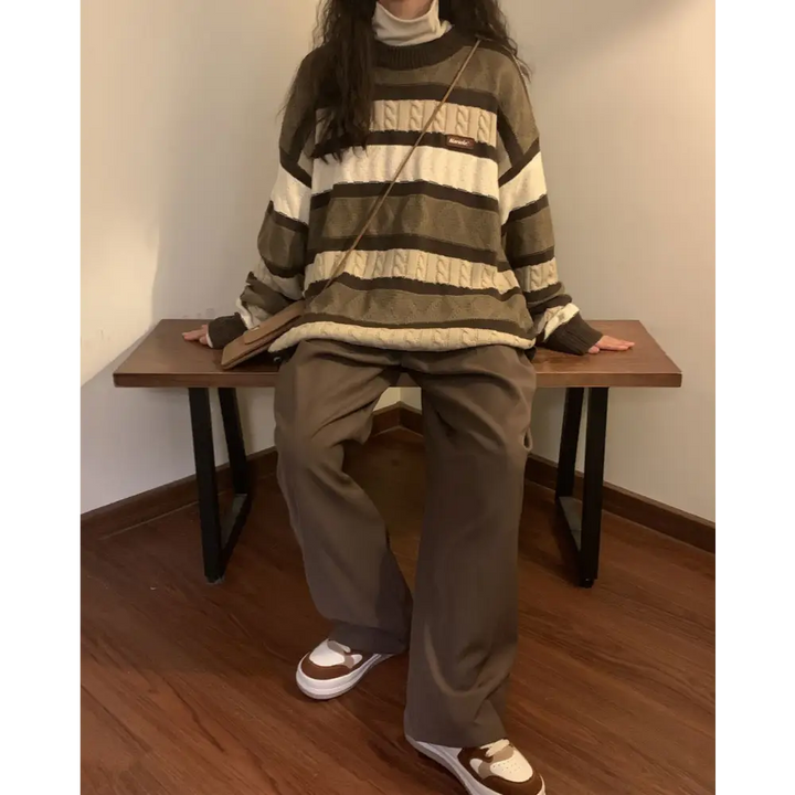 This vintage-style sweater features a unique brown knit construction that epitomizes a classic aesthetic with a modern twist. Its eye-catching striped design adds depth and visual interest, making it an excellent choice for those who appreciate the timeless appeal of Y2K fashion. The long sleeves offer warmth and comfort, making this sweater perfect for layering during the cooler months or wearing on its own for a casual yet stylish look.